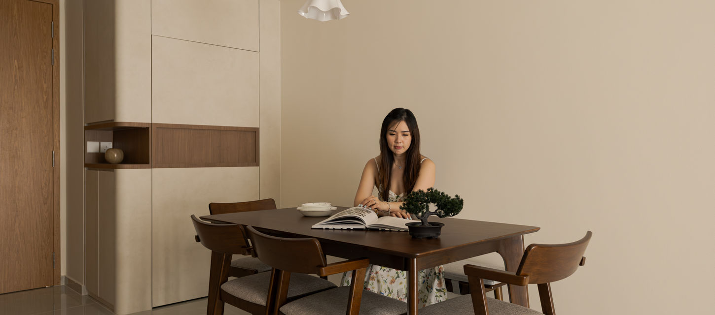 Natural light softly defines each space, flowing from the living area into the dining zone with effortless continuity. The home carries a gentle balance between structure and warmth, where clean lines meet organic materials. Textured wall finishes and curved joinery corners lend a tactile softness, while the use of warm wood and muted tones keeps the atmosphere calm and cohesive. The dining space, framed by minimalist lighting and subtle built-ins, reflects the same philosophy of quiet elegance that guides the entire home, intentional, grounded, and timeless.