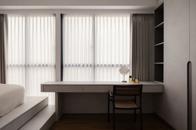 The ceiling features elegant recessed lighting with warm, glowing strips, creating a cozy yet modern ambiance, while large windows framed by soft natural light enhance the airy feel. Vertical wooden slats and a sleek marble surface add texture and refinement, crafting a serene and stylish interior.