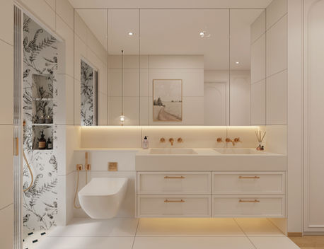 The bedroom features a serene and elegant aesthetic with a high ceiling accented by recessed lighting, enhancing the spacious feel. The walls are adorned with subtle paneling and decorative molding in a soft white palette, complemented by light hardwood flooring that adds warmth. A plush white rug with ribbed texture anchors the space, while integrated lighting and clean architectural lines contribute to a luxurious and tranquil ambiance. The toilet features a sleek, modern aesthetic with glossy white subway tiles covering the walls and a matching tiled floor, creating a clean and cohesive look. A large rectangular mirror reflects the space, enhanced by soft recessed lighting embedded in the ceiling, while a frosted glass window adds subtle natural light. The design incorporates clean lines, a neutral color palette, and a built-in niche with integrated lighting.