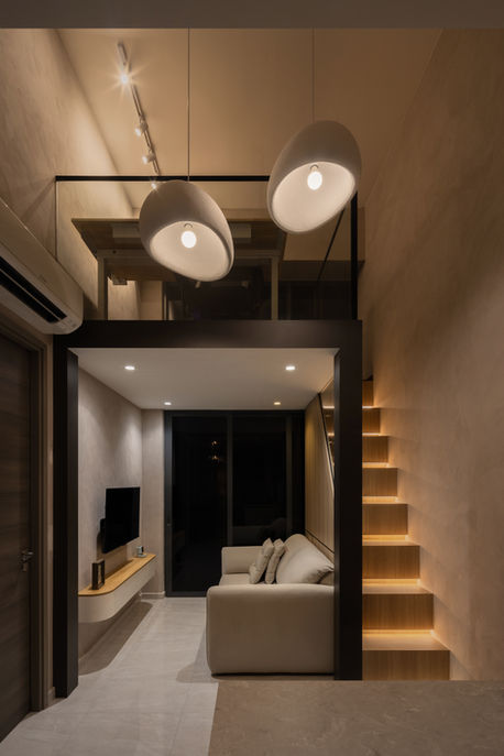 Defined lines and measured light guide the flow through this compact loft. The illuminated staircase becomes a sculptural centerpiece, connecting the lower living space with the loft above. Natural textures and balanced tones reveal a study in proportion, restraint and spatial harmony.