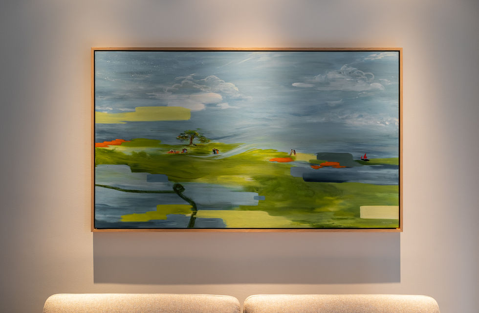 this space showcases a refined, modern aesthetic with a focus on clean lines and subtle elegance. A tall, sleek cabinet in a soft beige tone features a mix of open shelving with warm underlighting, highlighting minimalist decor like a sculptural vase and bottles, and closed storage for a clutter-free look. Adjacent to it, a frosted glass sliding door with vertical ribbing adds a touch of privacy while maintaining an airy feel, complemented by the luxurious marble flooring that reflects the ambient light. The combination of wood accents and neutral tones creates a harmonious and sophisticated atmosphere. The interior design of this living space radiates a serene, minimalist charm with a minimalist yet inviting approach. A plush, neutral-toned sofa serves as the centerpiece, draped with a cozy dark blanket that adds a touch of warmth and texture. Above the sofa, a vibrant abstract painting featuring a landscape of greens, yellows, and blues brings a lively focal point to the soft gray walls. Recessed ceiling lights cast a gentle, even glow, enhancing the room's airy feel and highlighting the clean lines and uncluttered aesthetic, creating a peaceful and stylish environment.
