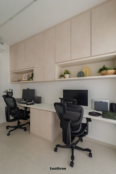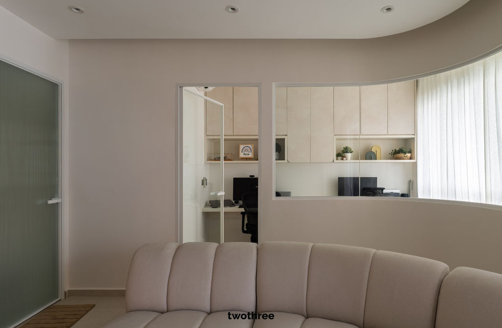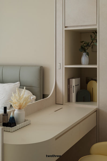 In the private spaces, the same design language continues with custom carpentry tailored to daily routines. The bedroom incorporates a built-in wardrobe with soft arched motifs and concealed handles, paired with a curved dressing table that creates a comfortable grooming corner without sharp edges. Storage is carefully integrated through full-height cabinets and open niches to balance display and practicality. A dedicated study room was designed with dual workstations, overhead storage, and ample task lighting, providing a focused environment that remains visually connected to the rest of the home through curved glass partitions. Throughout the home, thoughtful spatial planning, rounded forms, and muted materials work together to create a calm, functional living environment that feels timeless and quietly refined.
