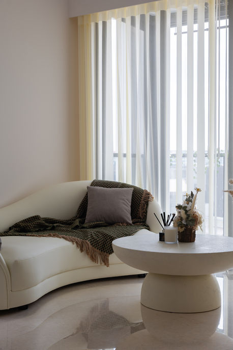 The design features a sleek, modern living space with a smooth, curved wall in a soft gray tone, accented by warm, integrated lighting along the edges and ceiling. Large windows with sheer curtains allow natural light to flood the room, enhancing the airy ambiance, while the light-colored flooring complements the minimalist aesthetic. The design emphasizes clean lines and a cohesive color palette, creating a serene and sophisticated atmosphere.